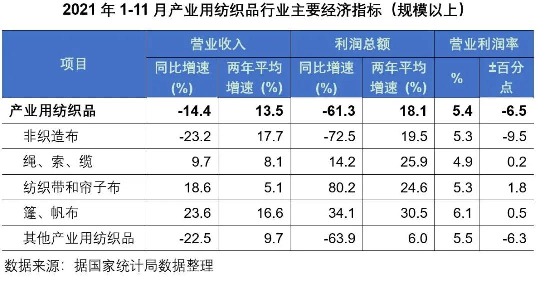 經(jīng)濟(jì)效益方面,1-11月產(chǎn)業(yè)用紡織品行業(yè)規(guī)模以上企業(yè)的營(yíng)業(yè)收入同比下降14.4%,兩年平均增長(zhǎng)13.5%,利潤(rùn)總額同比下降61.3%,兩年平均增長(zhǎng)18.1%,營(yíng)業(yè)利潤(rùn)率為5.4%,同比下降6.5個(gè)百分點(diǎn)。分領(lǐng)域看,非織造布行業(yè)的營(yíng)業(yè)收入和利潤(rùn)總額分別同比下降23.2%和72.5%,營(yíng)業(yè)利潤(rùn)率為5.3%,較上年同期下降9.5個(gè)百分點(diǎn);繩、索、纜行業(yè)的營(yíng)業(yè)收入和利潤(rùn)總額分別同比增長(zhǎng)9.7%和14.2%,營(yíng)業(yè)利潤(rùn)率為4.9%,同比增加0.2個(gè)百分點(diǎn);紡織帶和簾子布市場(chǎng)延續(xù)了良好的發(fā)展勢(shì)頭,營(yíng)業(yè)收入和利潤(rùn)總額分別同比增長(zhǎng)18.6%和80.2%,營(yíng)業(yè)利潤(rùn)率達(dá)到5.3%,同比增長(zhǎng)1.8個(gè)百分點(diǎn);篷、帆布的營(yíng)業(yè)收入和利潤(rùn)總額分別同比增長(zhǎng)23.6%和34.1%,6.1%的營(yíng)業(yè)利潤(rùn)率為行業(yè)最高;醫(yī)療衛(wèi)生、過(guò)濾、土工用紡織品所在的其他產(chǎn)業(yè)用紡織品的營(yíng)業(yè)收入和利潤(rùn)總額分別同比下降22.5%和63.9%,營(yíng)業(yè)利潤(rùn)率為5.5%,同比下降6.3個(gè)百分點(diǎn)。