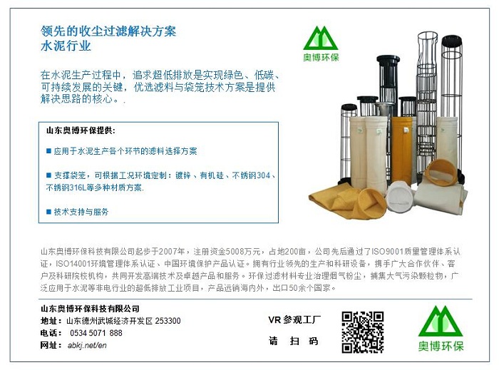 文章詳細(xì)分享了超低排放背景下,在水泥行業(yè)的各個(gè)生產(chǎn)環(huán)節(jié)(窯頭、窯尾、水泥磨、煤磨等)的煙氣收塵特性,針對(duì)性的提出濾料與袋籠的選用技術(shù)。并提出了納米濾料表面處理技術(shù)的發(fā)展趨勢(shì)。山東奧博環(huán)保一直走在濾袋和袋籠發(fā)展的最前沿,不僅關(guān)注當(dāng)下水泥行業(yè)的最新動(dòng)態(tài),更著眼于幫助水泥等工業(yè)解決未來(lái)可能遇到的種種挑戰(zhàn),相信在國(guó)內(nèi)外水泥行業(yè)的收塵過(guò)濾技術(shù)方面會(huì)有更大的提升。