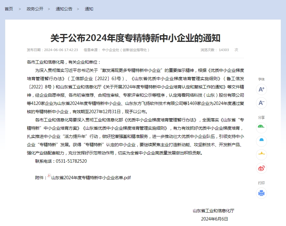 山東省工業(yè)和信息化廳近期公布2024年度山東省專(zhuān)精特新中小企業(yè)名單,我司順利通過(guò)本次復(fù)審工作,再次獲得專(zhuān)精特新中小企業(yè)的殊榮。