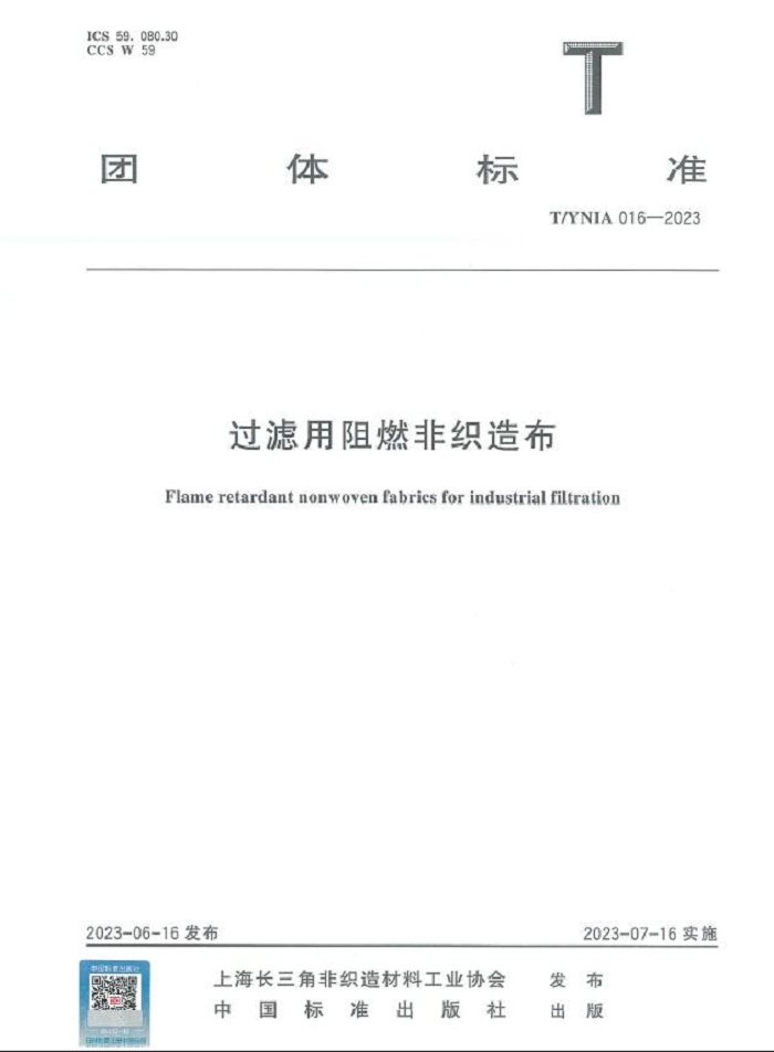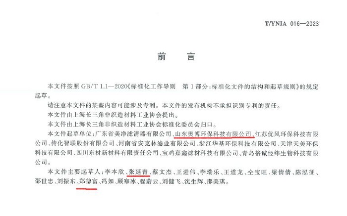 T/YNIA016-2023《過濾用阻燃非制造布》由上海長三角非織造材料工業(yè)協(xié)會權(quán)威發(fā)布,山東奧博環(huán)保科技有限公司為主要完成單位
